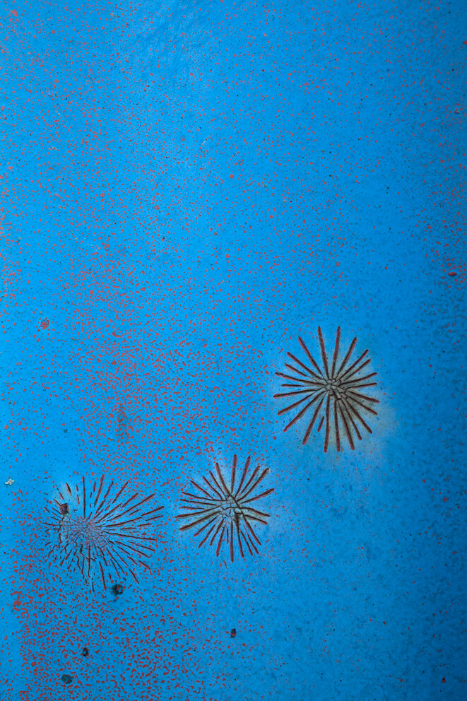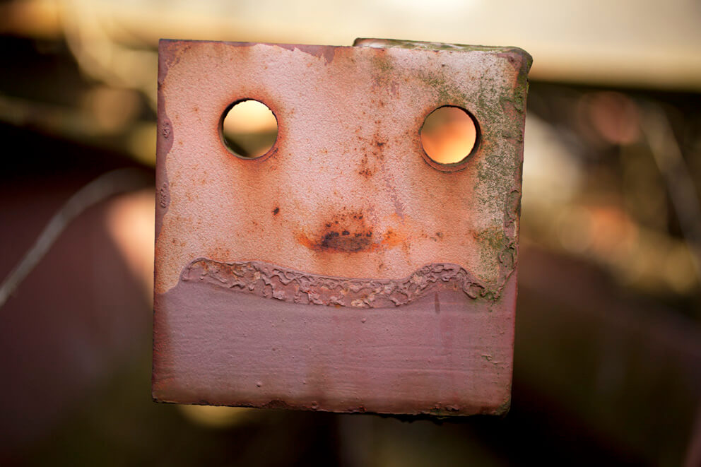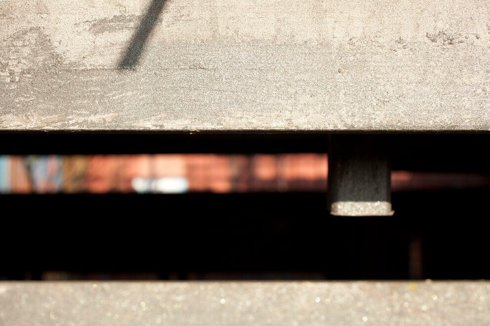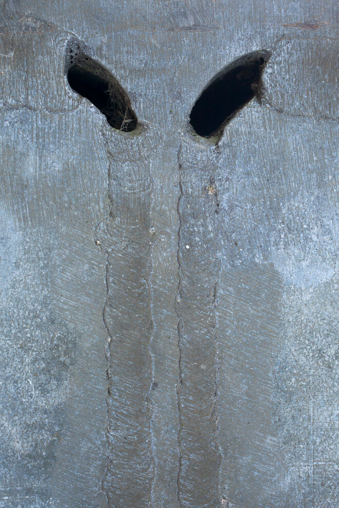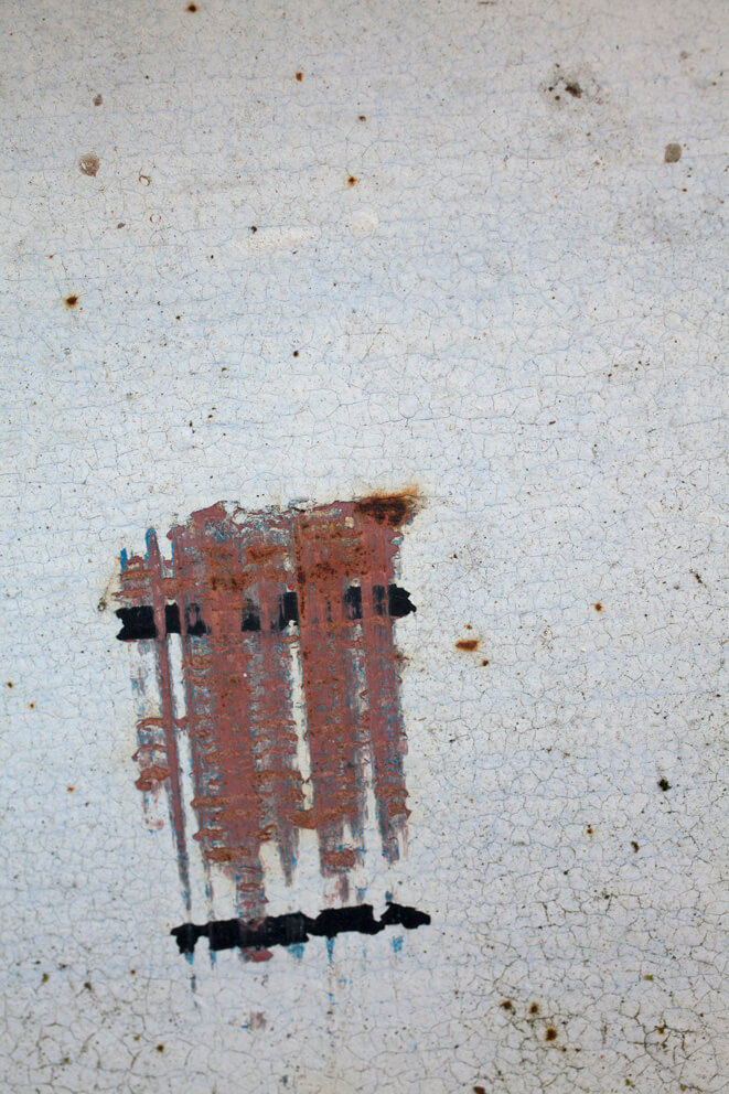Het kost mij wat meer tijd om mijn draai te vinden. Los komen van de bestaande vormen en op zoek gaan naar abstractie. Uiteindelijk vind ik een begin: twee Vergeten Gezichten die mij aankijken, als stille getuigen, op stalen onderdelen van het gebouw (zie hierna mijn foto’s).