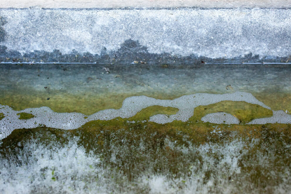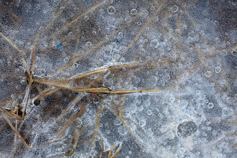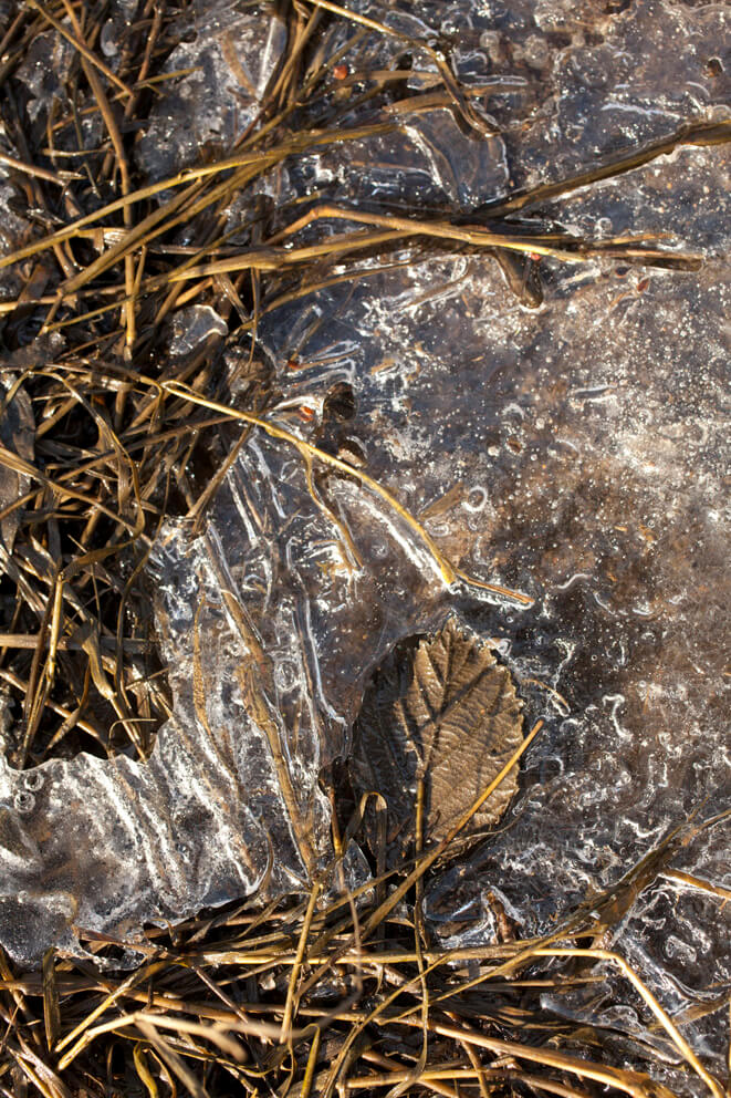 Nadat we ons door de begroeiing hebben gewrongen en weer van takken hebben ontdaan komen we aan de andere kant van de werf in de schaduw wat bevroren grond tegen. Het begint net een beetje te ontdooien. Ik word meteen enthousiast, want dit is echt zo’n situatie die maar kort bestaat. Over een half uur heeft de zon de voorstelling al weer laten verdwijnen.