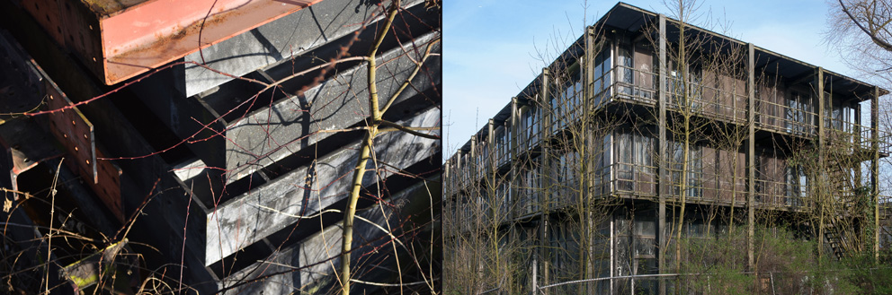 Tijdens de inspirerende uitreiking van de Lefgozahs awards 2016 van de Mannen van Schuim, tipte Leon Thier van Studio Leon Thier me over een werf in Pijnacker waar het Van Klingeren gebouw ligt opgeslagen. Dat klonk me goed in de oren in meerdere opzichten. Ten eerste vind ik het erg stoer en bewonderingswaardig dat je je zo inzet om een gebouw van kwaliteit te behouden (meer info over dit project onderaan deze blog)*. Ten tweede, hou ik er altijd van dit soort terreinen met rafelranden af te struinen, op zoek naar ‘Schoonheid van het Niets’. Voor mij dus redenen genoeg om op ‘foto-safari’ te gaan. Als teamgenoot nodigde ik fotograaf Peter de Ruig uit omdat hij het Van Klingeren gebouw meerdere keren fotografeerde toen het nog in Ockenburgh stond.