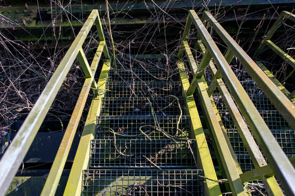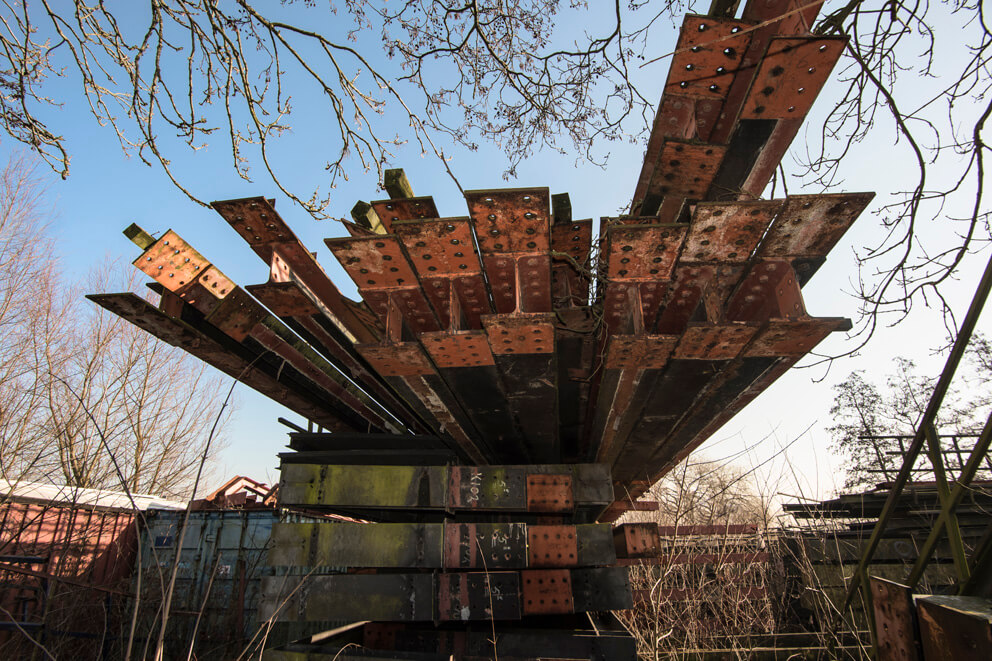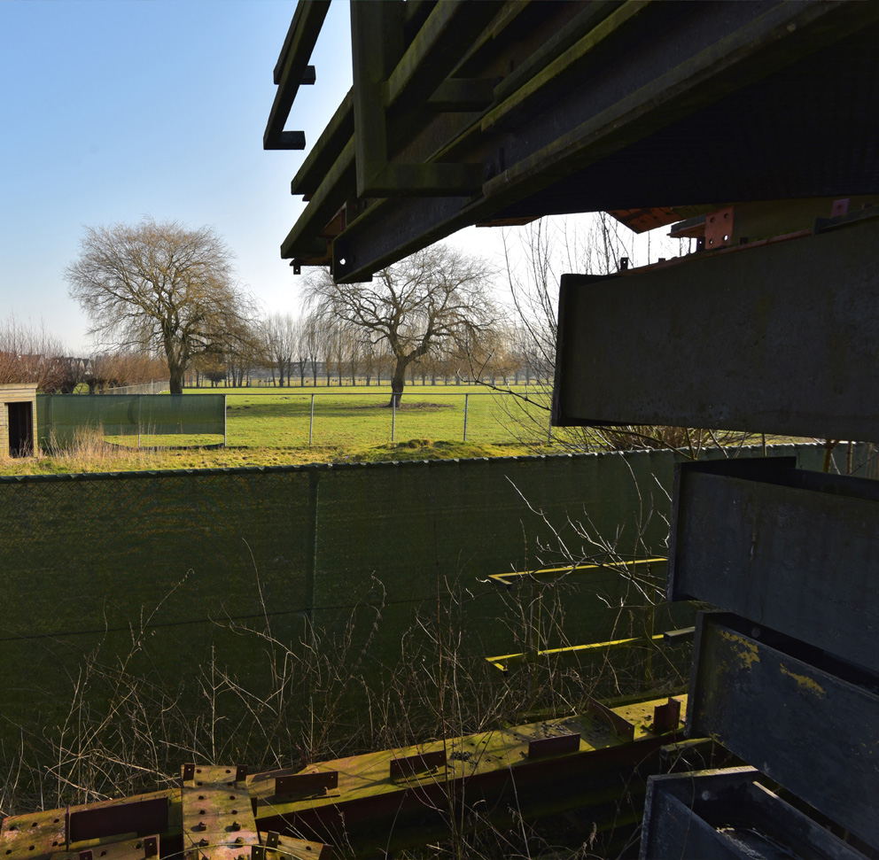 Het heeft ’s nachts gevroren en er ligt hier en daar nog wat ijs. Het licht en de gaten in de stalen kolommen zorgen voor interessante accenten. Trappen komen uit in het niets. We laten ons vertellen dat de kozijnen in de paar zeecontainers zijn opgeslagen die ook het terrein staan.