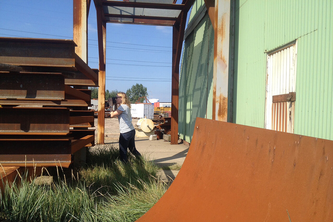 Het zonnetje schijnt, een koel briesje wind waait door mijn haar. Concentratie. Alle gedachten vervagen. De wereld bestaat uit composities en kleurvlakken. Zie ik iets waar mijn oog aan blijft haken om vervolgens bij in te zoomen en een nieuwe schat te ontdekken… Machines rijden af en aan. Stofwolken. Hier wordt zwaar werk verricht.
