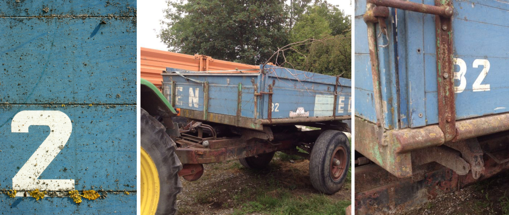 Maar soms kom ik het onderwerp weer tegen en verbaas ik me erover dat ik het eerder herkend heb als schat. Zo kwam ik deze zomervakantie op weg naar Oostenrijk voor de tweede keer op een camping bij Ulm in Duitsland. Ik herinnerde me dat ik daar 5 jaar geleden mijn ‘nr 2’ gespot had. Onlangs was er een klant bij me die overwoog om deze foto te kopen. Ze vroeg me wat de foto eigenlijk was. Dat is een vraag die veel gesteld wordt; ik geef het beeld een nieuwe functie, maar mensen willen altijd de oude weten. In dit geval wist ik het niet meer zo goed. Tsja, iets op een boerenerf. Toen ik echter opnieuw het terrein om de camping bekeek, ontdekte ik opeens mijn ‘nr 2’: op de zijkant van een aanhangwagen van een tractor. Het mooie licht en het gele mosje erop ontbraken echter, net zoals de 2 vliegen met mooie schaduwpartijen schitterden door afwezigheid.